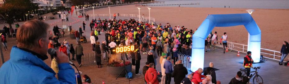 Um 17 Uhr ertönte das Startsignal für die 6- und 12-Kilometer-Läufe. Der Leiter der Feuerwehr Lübeck, Thomas Köstler, ließ erneut das maritime Nebelhorn erklingen. Die Strecke führte die Läufer vom Brügmanngarten entlang der Travemünder Promenade auf die Nordermole, um den Leuchtturm herum und unterhalb der Promenade zurück. Die romantische Beleuchtung und Feuerkörbe schufen eine unvergessliche Atmosphäre. Nach dem Lauf freuten sich alle über die Wärmezelte und das warme Essen und Trinken. Jede Läuferin erhielt eine gelbe Rose als kleine Überraschung.